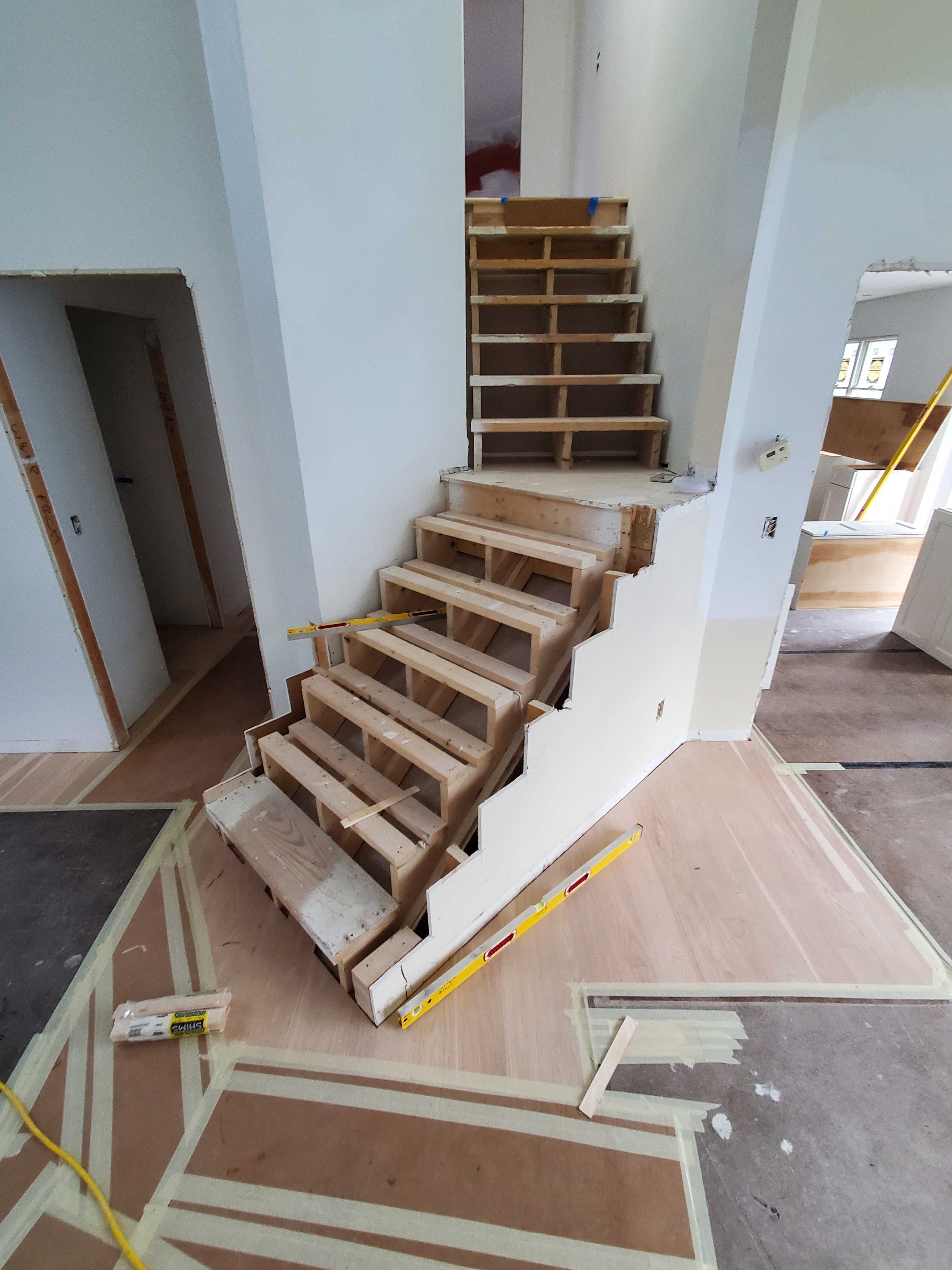 - Stringers – These are the structural part of the stairs that the treads and risers sit on. These are traditionally cut from dimensional lumber, but some builders use engineered lumber like LVL because it is available in longer or deeper pieces and it is straight and stable.