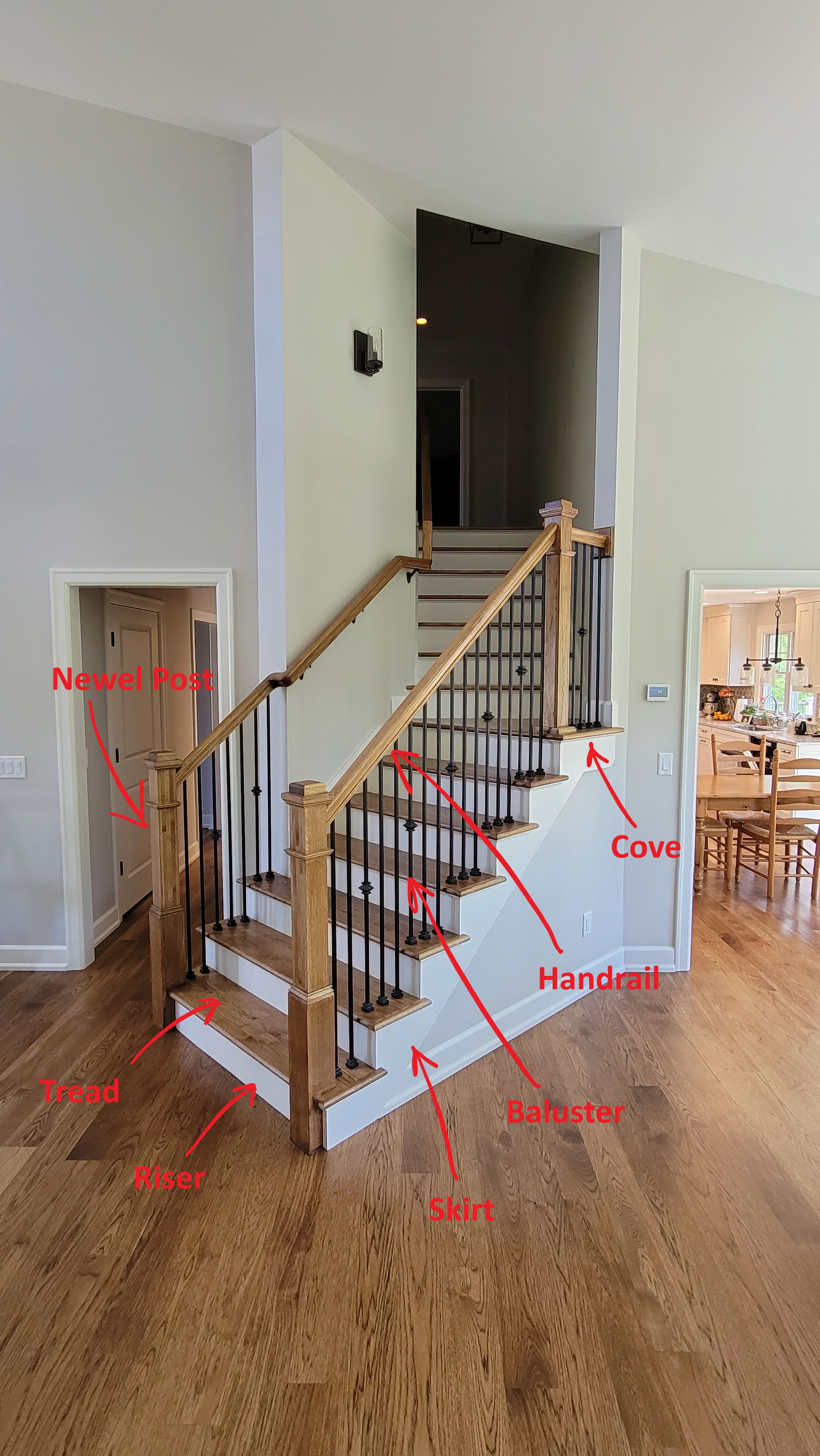 - Cove – This is a trim element installed in the corner where the nosing from one tread projects past the riser below, and is both decorative and conceals the gap between the two boards.